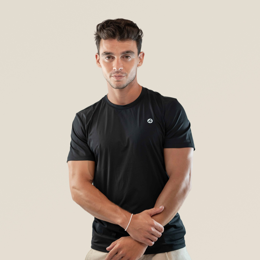 חולצת אימון צמודה בצבע שחור בגזרה מינימליסטית ומדויקת.